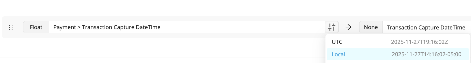 Lors de l’exportation des transactions par carte à l’aide d’un fichier CSV personnalisé, le fuseau horaire par défaut est UTC, mais il peut être modifié à « Local ».
