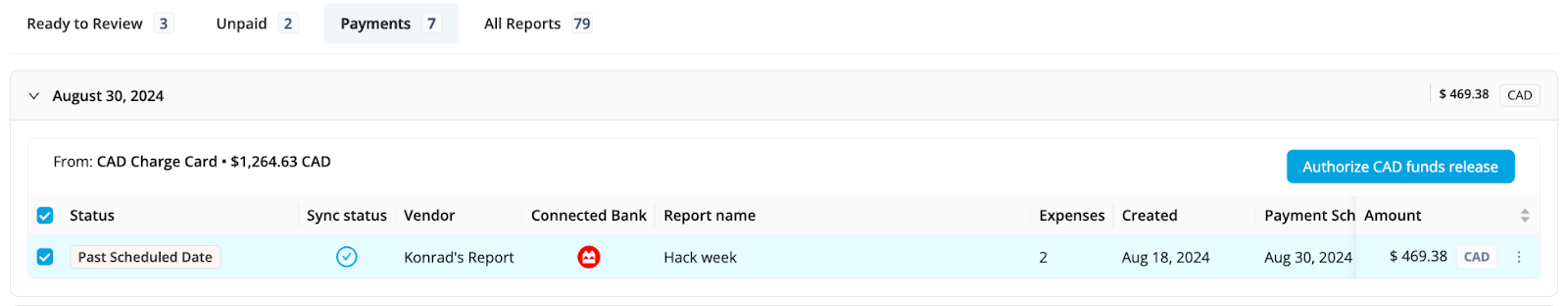 - Sélectionnez un groupe de paiements ou un rapport individuel et cliquez sur Autoriser le déblocage de fonds en $ CA ou $ US. Cela autorise tous les paiements de ce groupe qui sont programmés le même jour