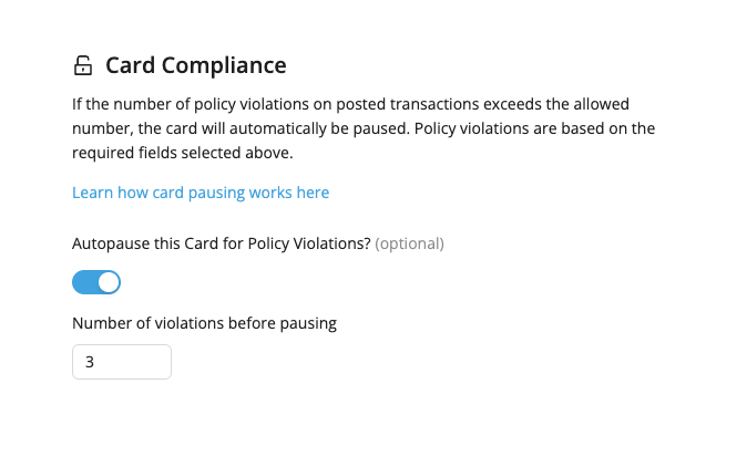 Si un utilisateur ne soumet pas les informations requises concernant la transaction dans les 24 heures, celle-ci est considérée comme non conforme. La fonctionnalité de mise en pause automatique permet de faire respecter cette exigence en limitant temporairement l’utilisation de la carte. Lorsqu’un utilisateur atteint la limite de transactions non conformes fixée par un administrateur, sa carte est automatiquement mise en pause et ne peut être réactivée qu’après soumission des informations manquantes concernant la transaction.
