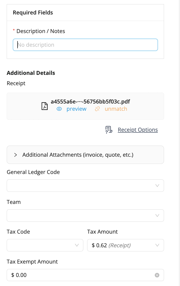 Après avoir effectué une transaction avec votre carte Float, vous pourrez ajouter les détails de la transaction requis (comme un reçu, une description, etc.) par l’intermédiaire de la page Transactions, de l’application mobile de Float ou d’un lien reçu par courriel ou message texte . Les champs requis dépendent de la Politique de Soumission impliquée.