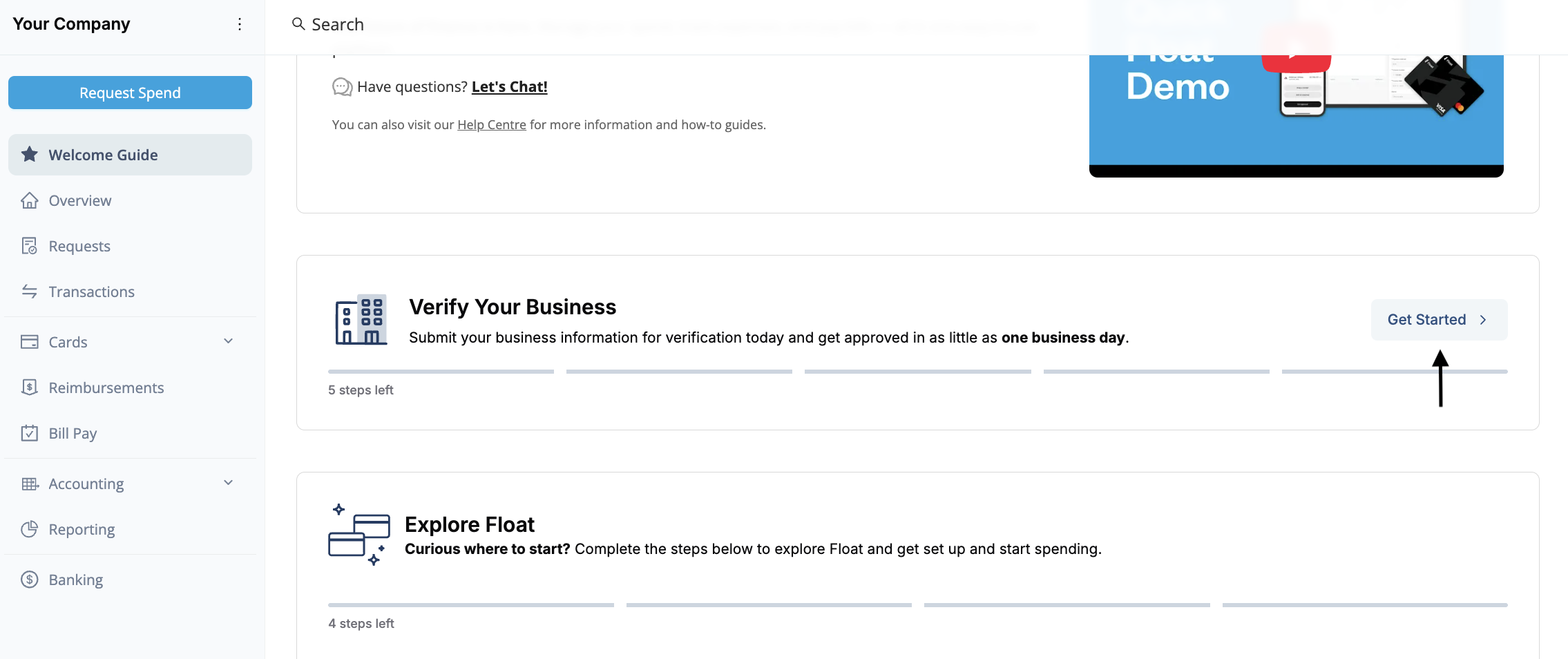 Une fois que vous avez terminé l’inscription à un compte Float, vous devrez entreprendre le processus de vérification de votre entreprise, également connu comme KYB. Les étapes ci-dessous vous expliquent comment mener à bien ce processus de vérification.