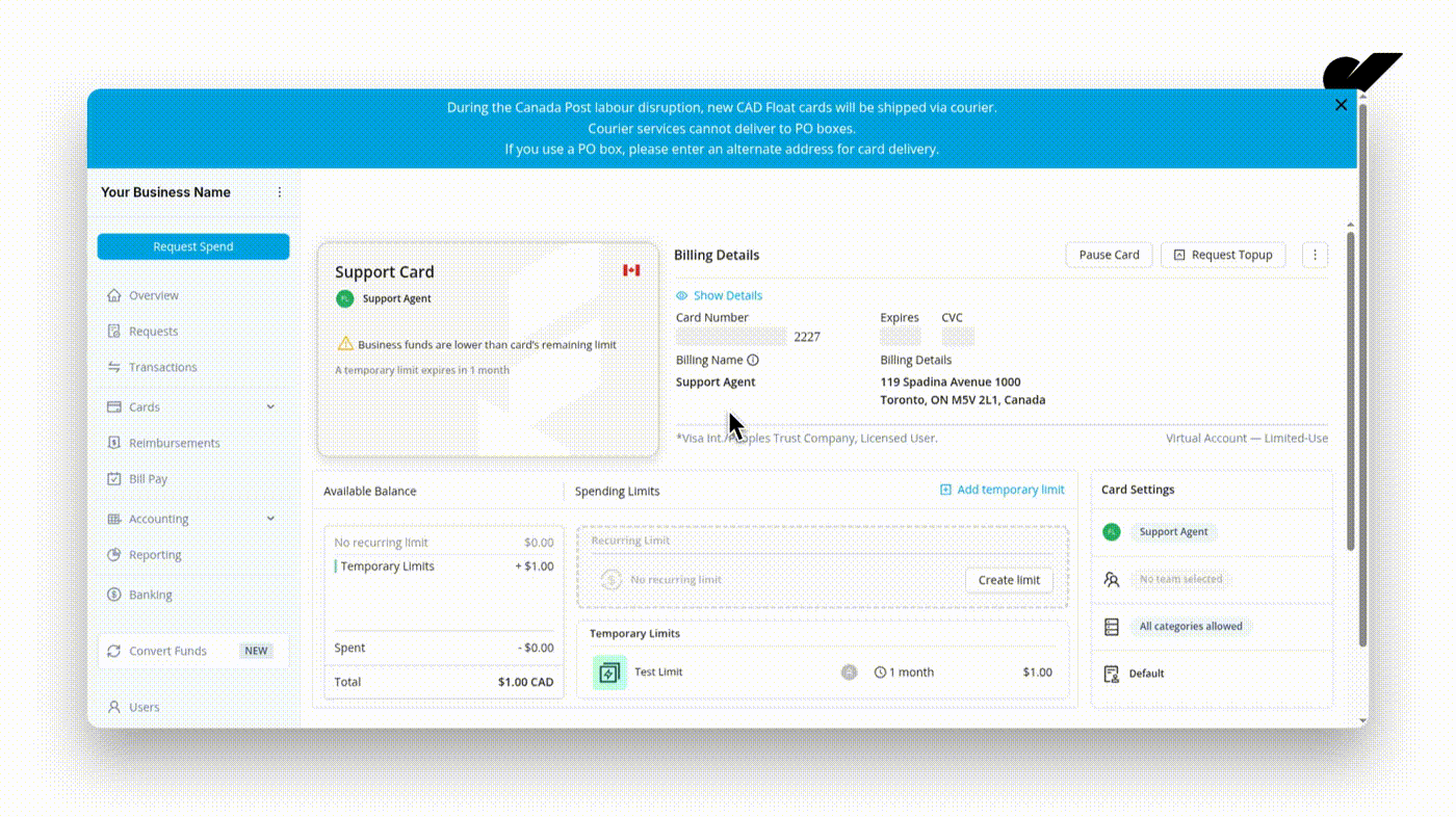 La suppression automatique des cartes virtuelles qui n'ont aucune limite active aide à maintenir l'organisation de votre compte en éliminant les cartes dont vous n'avez plus besoin. Cela peut être particulièrement utile pour les cartes virtuelles à usage unique, comme celles créées pour un fournisseur précis ou un projet à court terme. Lorsque la carte est activée, elle sera supprimée automatiquement dès que toutes les limites auront expiré, afin de vous aider à maintenir l'organisation de votre compte.