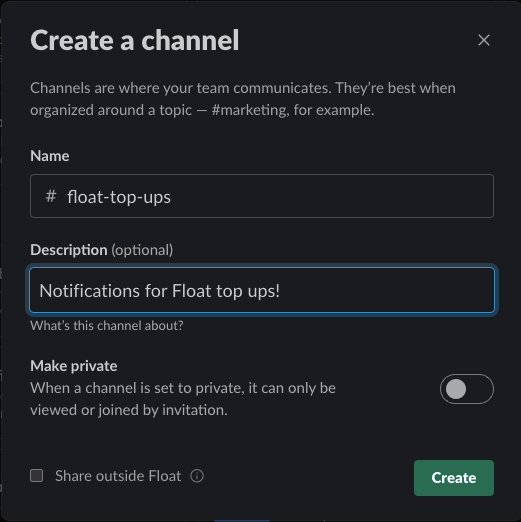 Si vous souhaitez que les notifications soient envoyées dans un canal Slack dédié, créez-le avant d’associer Float :