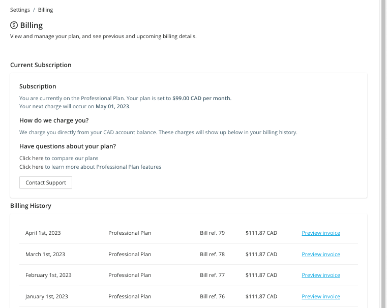 Pour mettre à niveau votre compte vers Professionnel, envoyez un courriel à votre gestionnaire de compte ou à support@floatfinancial.com. Dans la plupart des cas, lorsque vous passez de l’abonnement Essentiel à l’abonnement Professionnel, vous êtes facturé immédiatement au prorata. Les factures suivantes seront établies le 1er de chaque mois.